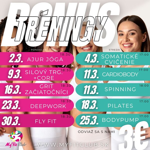 A preto dávame niečo, čo tu ešte nebolo. Počas CELÉHO MARCA Každý PONDELOK a STREDU BONUS hodiny Len za 3€ Áno, vážne. 3€. Žiadne malé písmená. Žiadne „ale“. Len energia, atmosféra a poriadna dávka pohybu. Toto ti niekto ešte nedal. A my sme sa rozhodli, že áno. Tak čo? Prídeš si to vyskúšať alebo budeš veriť tým, čo ti hovorili, že lacnejšie to nebude?